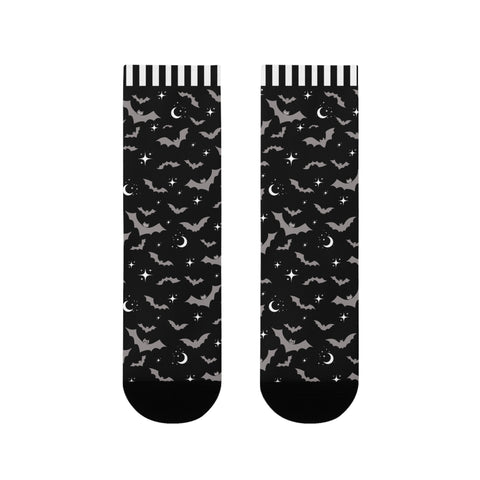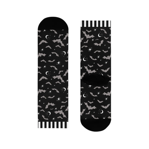 Slip into midnight and let your steps join the flutter of wings. These crew socks wrap your calves in an all-over pattern of silhouetted bats, crescent moons, and scattered stars — a low-key, spooky vibe for those who keep a little nocturnal magic in their wardrobe. The black-and-gray palette keeps the look versatile: wear them with ankle boots, platform sneakers, or let them peek above a skirt for a playful contrast. They’re breathable against the skin with a soft cotton interior, and the vibrant sublimation print keeps the design crisp wash after wash. Whether you’re settling in for a cozy movie night, wandering through a moonlit street, or adding a subversive accent to everyday outfits, these socks bring a subtle, atmospheric edge.