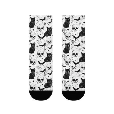 Spooky Black & White Skull and Cat Crew Socks — Halloween Sublimation Socks