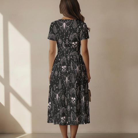 Embrace dark romance with this skull and moth print midi dress, featuring a delicate light pink design set against a deep black base. Blending softness with edge, this piece captures the beauty of contrast — ethereal moths and intricate skull details brought to life in a subtle pastel tone. Crafted from a soft and stretchy fabric blend (95% polyester, 5% spandex), this dress offers both comfort and structure. The fitted, slanted V-neckline creates a flattering silhouette, while the hidden side zipper ensures a smooth, close fit that’s easy to slip on and off.